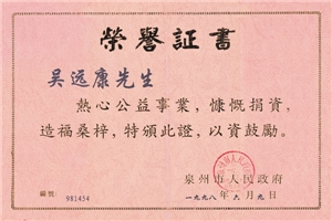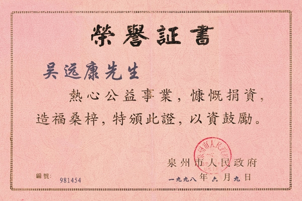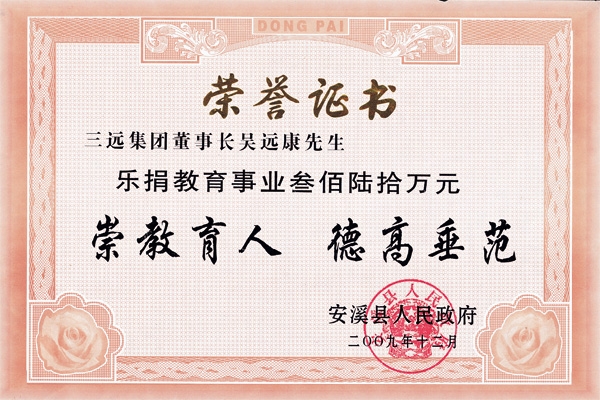 三遠(yuǎn)集團(tuán)董事長、總裁吳遠(yuǎn)康先生獲“熱心公益,慷慨捐資,造福桑梓”榮譽(yù)證書 |