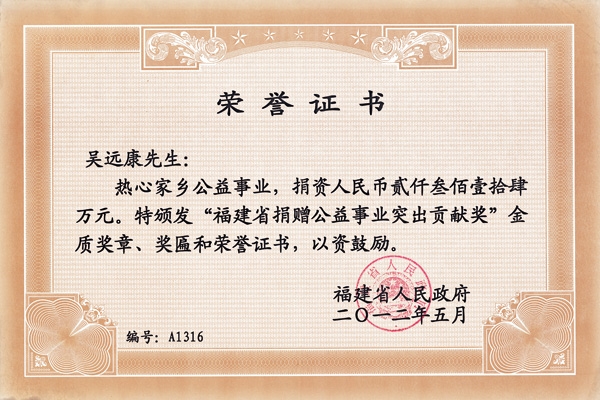 三遠(yuǎn)集團(tuán)董事長、總裁吳遠(yuǎn)康先生榮獲福建省捐贈公益事業(yè)突出貢獻(xiàn)獎 |