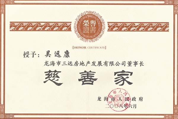 三遠(yuǎn)集團(tuán)董事長、總裁吳遠(yuǎn)康先生被授予“龍海市慈善家”稱號 |