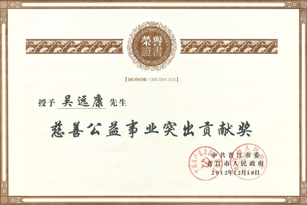 三遠集團董事長、總裁吳遠康先生榮獲晉江市捐贈公益事業突出貢獻獎